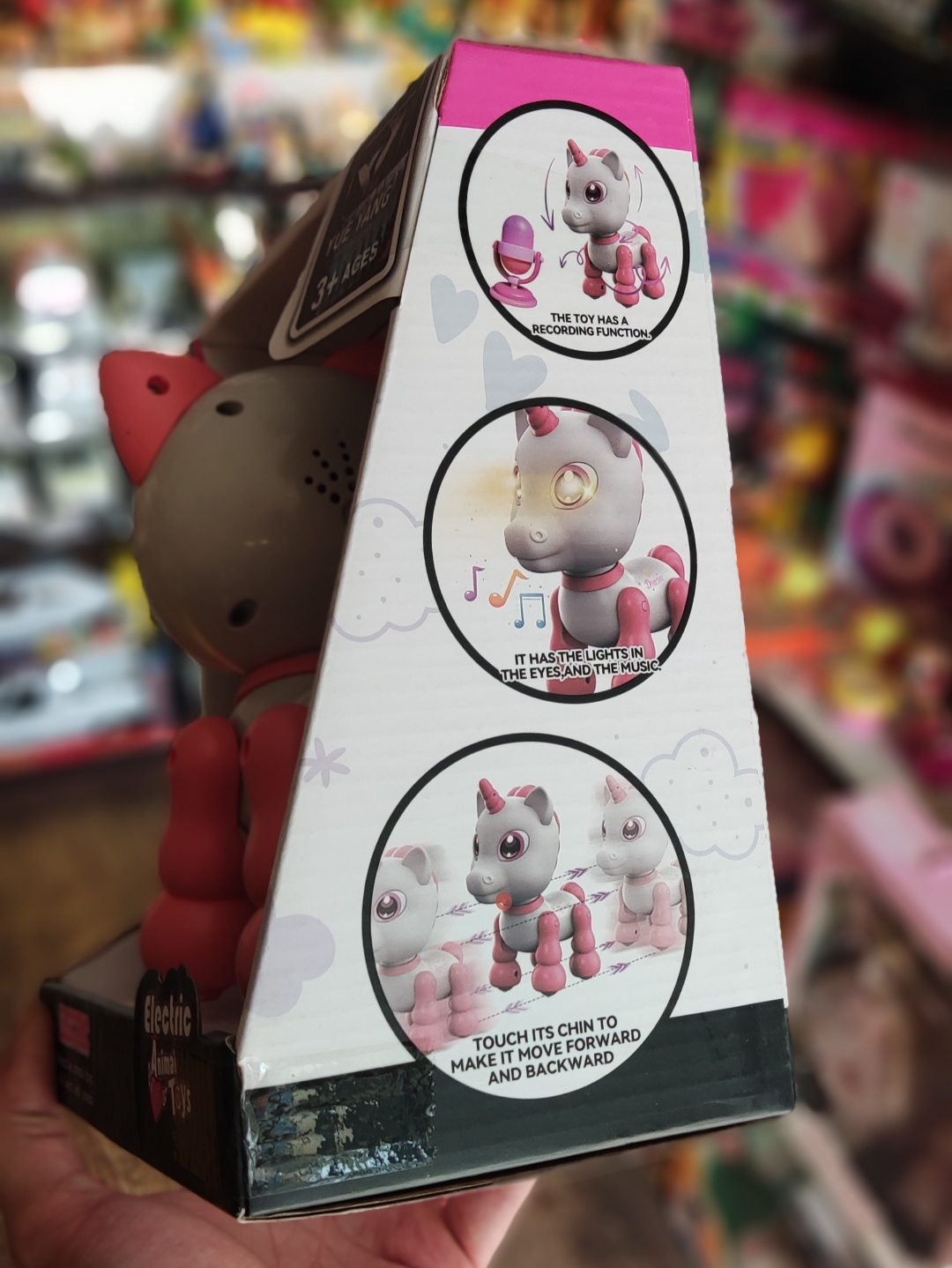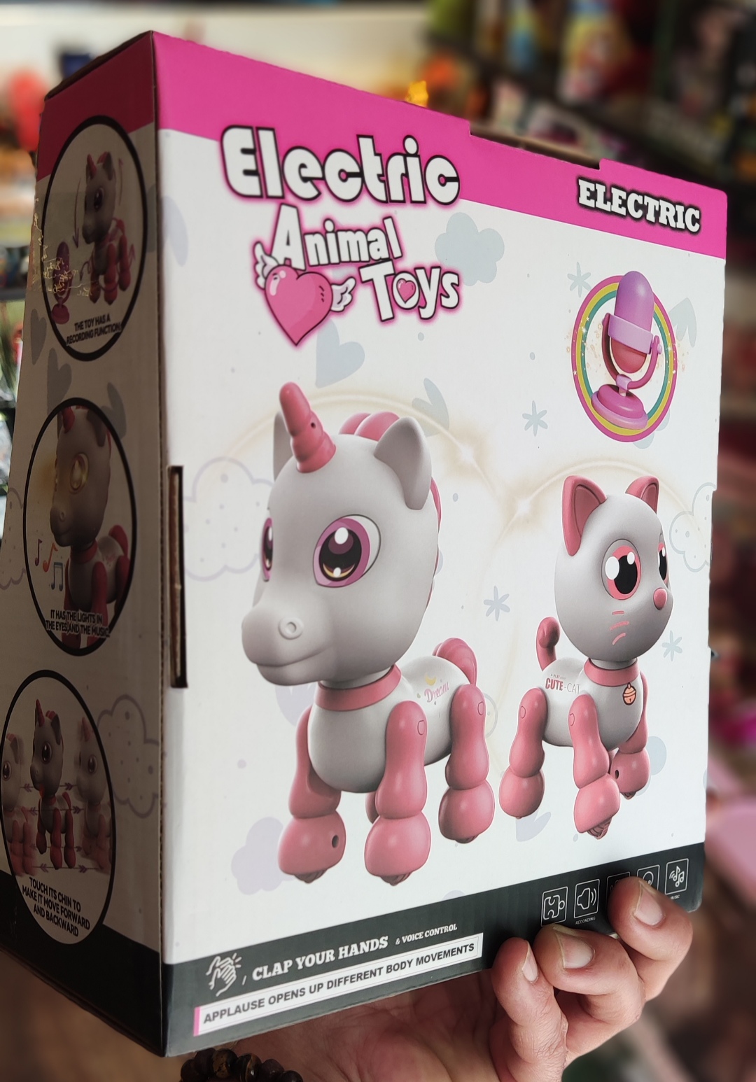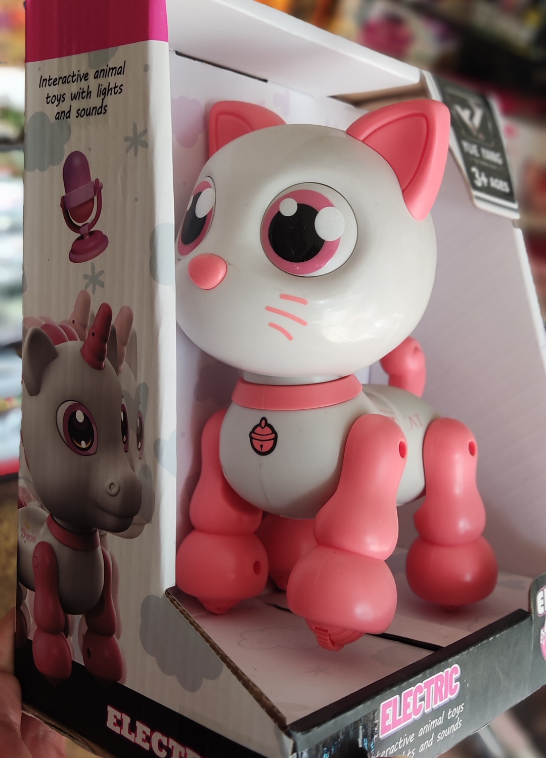 نیاز به دو عدد باطری قلمی دارد راه میره و تقلید صدا داره و سنسور تاچ دارد با لمس کردن زیر گردن واکنش نشان میدهد